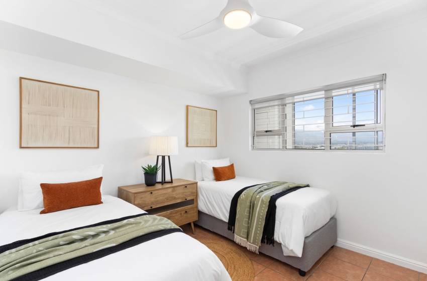 Welcome to Odeon Towers 1007, an elegant self-catering apartment perched on the 10th floor of a modern complex along Strand’s renowned Beach Road. Boasting breathtaking ocean views and a thoughtfully designed interior, this spacious two-bedroom retreat offers the perfect blend of comfort and sophistication, making it ideal for families or small groups of up to four guests.