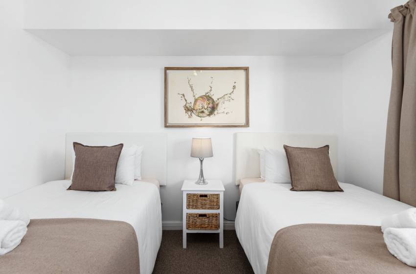 The main bedroom features a queen-sized bed and an en-suite bathroom fitted with a bath, shower, toilet, and washbasin. The second bedroom is furnished with two 3/4 beds and has access to a second bathroom with shower facilities. Additionally, there is a separate toilet for convenience. The open-plan kitchen is fully equipped with a fridge-freezer, microwave, oven, stove, airfryer, dishwasher, washing machine, cutlery, crockery, and tea-and-coffee-making facilities, seamlessly blending into the living area where a dining table, TV, and comfortable couches await.
