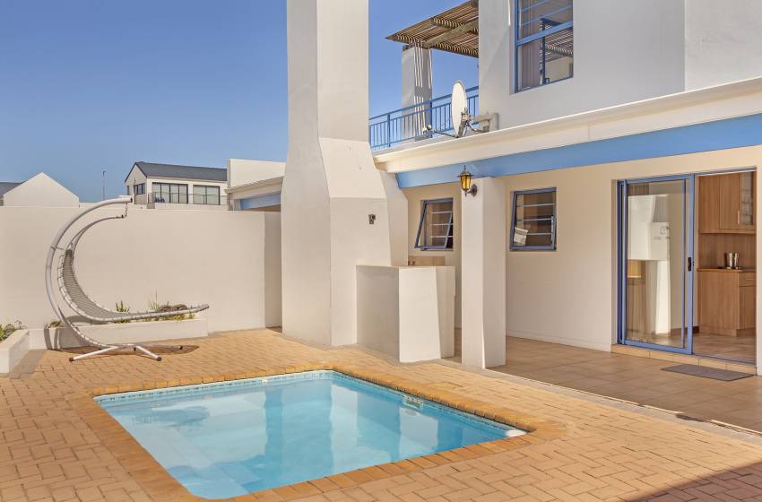 The house has the space and amenities to suit all your needs while enjoying a well-deserved vacation in one of Cape Town's most beautiful areas. An open plan living area leads to an enclosed patio with built-in braai/ BBQ and opens up to a perfectly blue splash pool to enjoy in the hot summer months. The kitchen is well equipped for a self-catering stay, and there is a guest toilet on the ground floor. There is streaming enabled smart TVs downstairs as well as upstairs with Showmax for relaxing nights in.