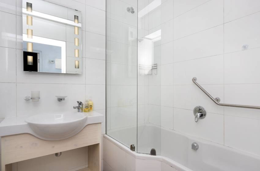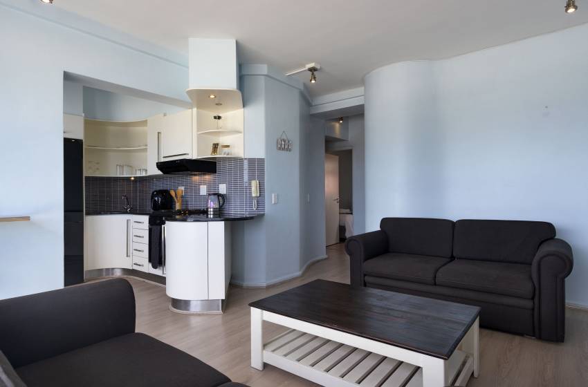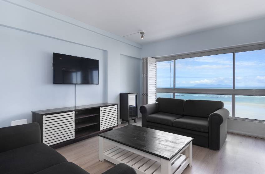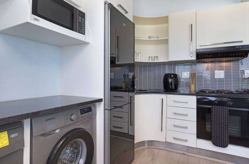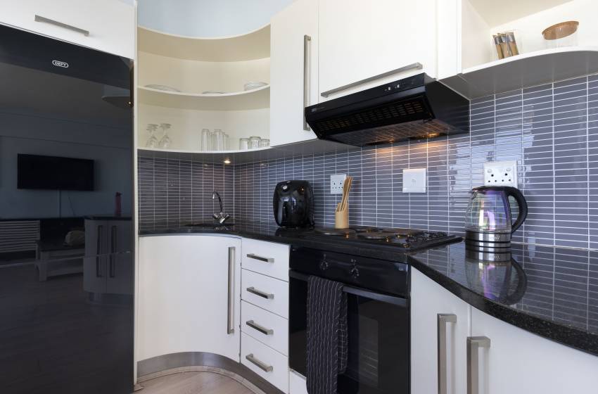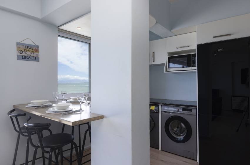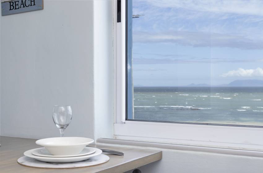 Guests are offered a sizeable fully equipped kitchen which includes an air fryer, washing machine, tumble dryer as well as all the necessary kitchen contents to cook up your favorite dishes. The open plan design of the apartment creates an intimate space, with the kitchen, dining, and living area all flowing into each other. The kitchen overlooks the cozy lounge area with a dining area separating the two able to seat four people comfortably. The lounge is fitted with a flat-screen TV and boasts large windows which show off the beautiful ocean views.