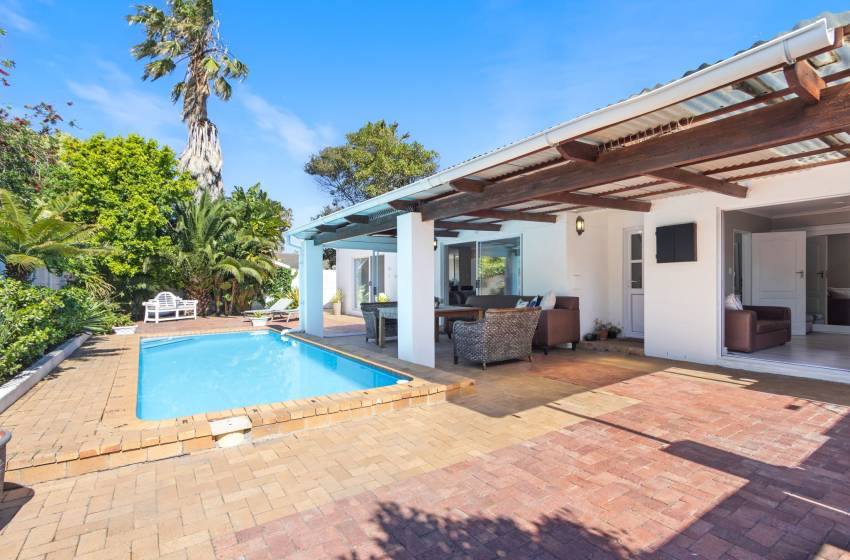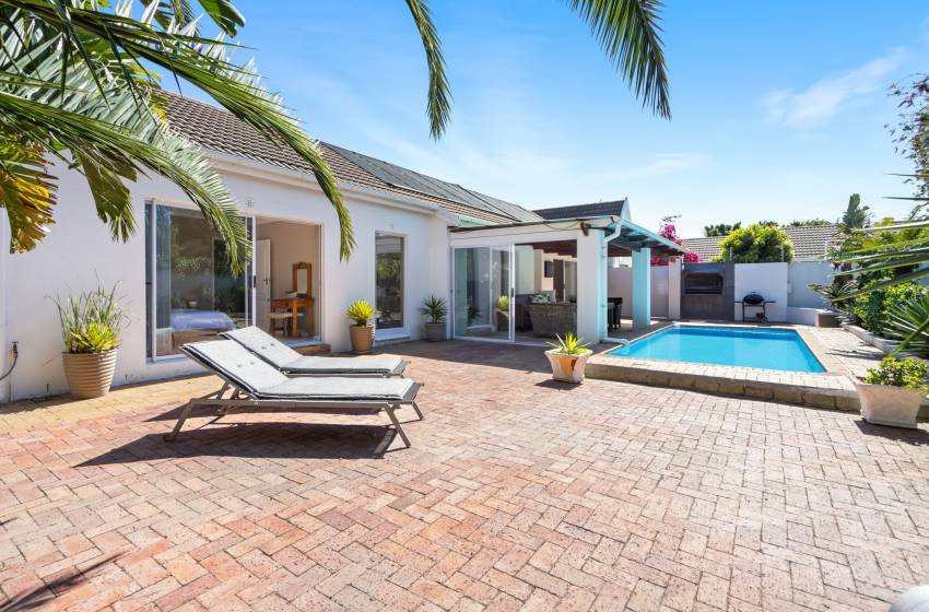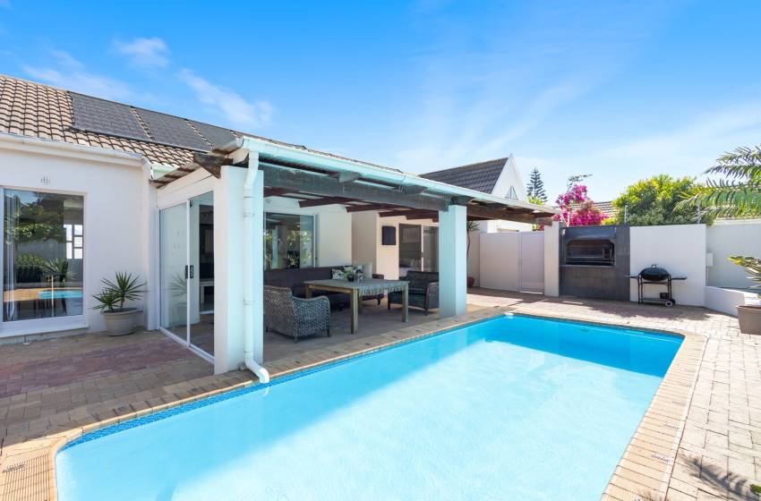 Guests will appreciate the amenities, which include internet access, Parking, including a garage with tandem parking for two cars and a cosy dining area. The lounge is perfect for relaxation, featuring a television for your entertainment needs. Featuring a bar area with a bar fridge. Step outside to discover a private garden and an inviting outdoor solar heated pool, perfect for enjoying sunny days. There’s a lovely braai/barbecue area. With towels and linen provided, you can settle in, knowing your comfort is a priority.