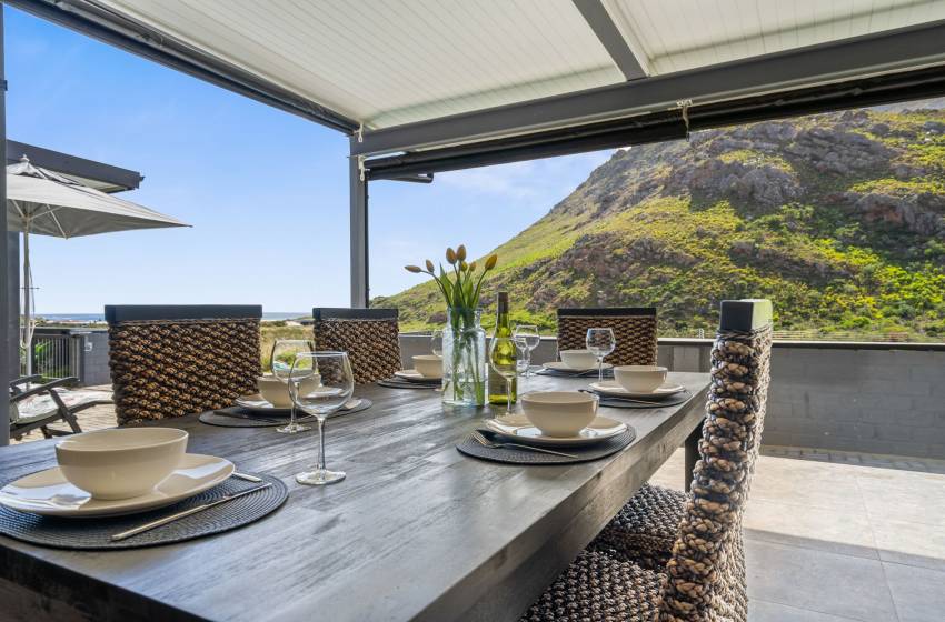 There are two dining areas to enjoy, one that seats 8 guests indoors and another that seats 6 in a covered outdoor space with braai facilities. From the outdoor dining area, guests can relax on loungers, soak up the sun, and take in the magnificent views. Adding to the charm, the property boasts a wooden deck with a wood-fired hot tub, offering the perfect spot to unwind in style. The entire property boasts sliding doors off each space in the house, including all three bedrooms allowing access to the outside space and showing off the spectacular mountain and ocean views providing pure tranquillity. Internet access is also available throughout the property.