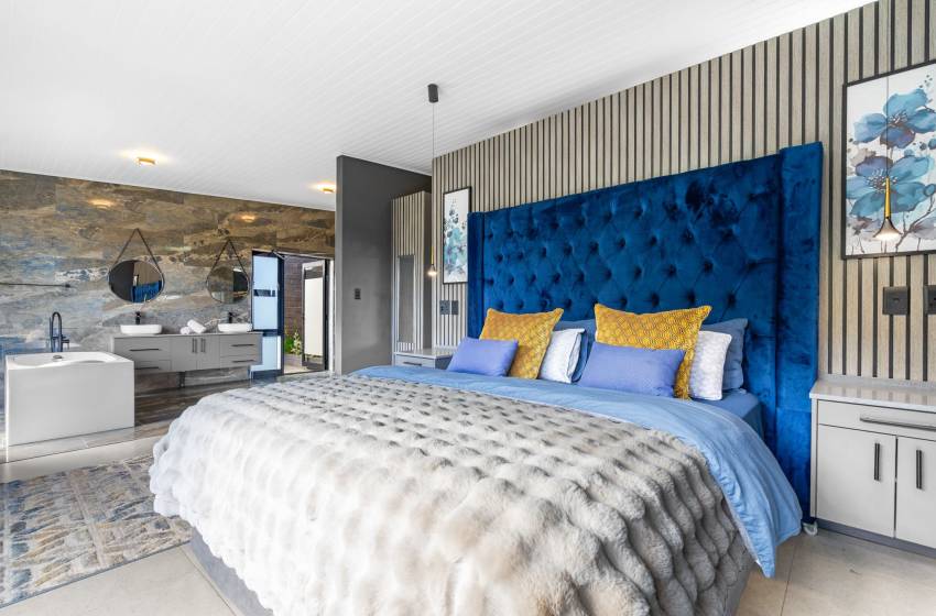 Leading you to the bedrooms is a hallway creating a peaceful ambience with a beautiful rock wall, pebbles and plants feature. bedrooms include a king bed in the first bedroom, a double bed in the second, and two single beds in the third bedroom. All three bedrooms have en-suit bathrooms for added privacy, all including a shower, toilet, basin with vanity and a bath featured in the main bedroom en-suite. Linen and towels are provided with your stay.