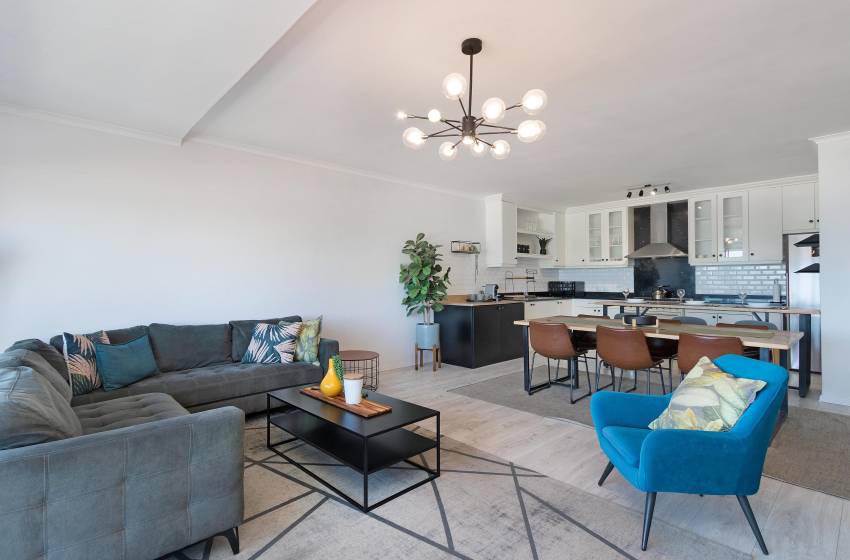 This spacious 130m² apartment features three bedrooms accommodating up to six guests comfortably. The open-plan kitchen, dining, and lounge areas seamlessly flow onto a wide balcony, where large windows frame the mesmerising view of False Bay. The kitchen is fully equipped with SMEG appliances, a coffee machine, a washer and dryer, and all the modern conveniences to enhance your stay.