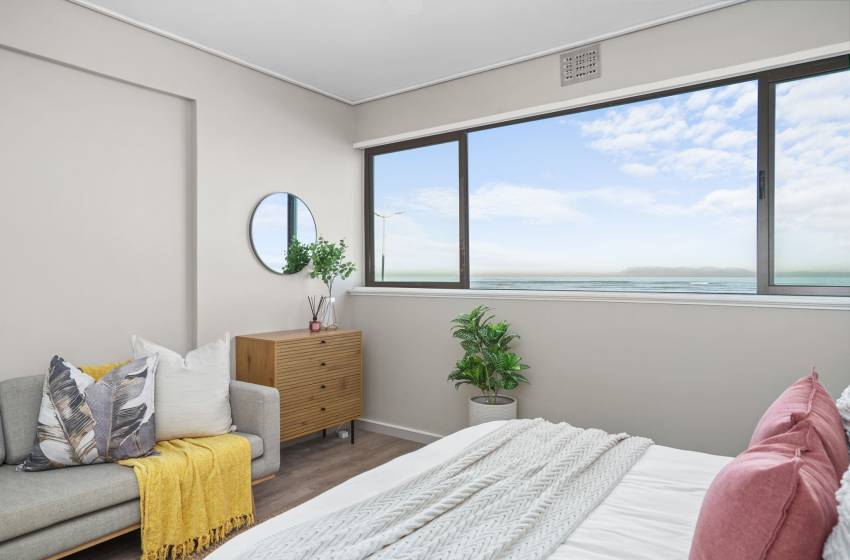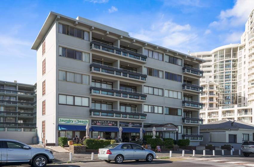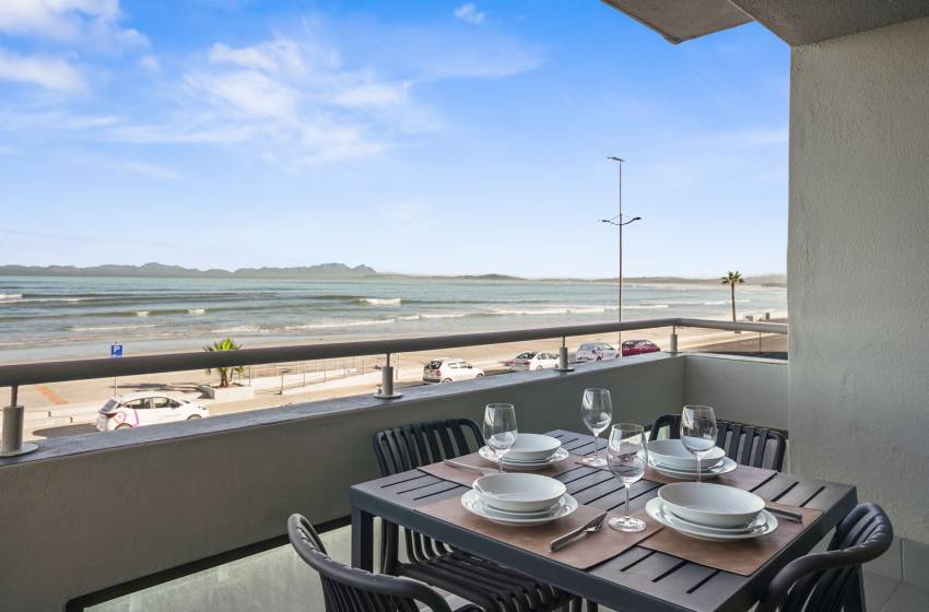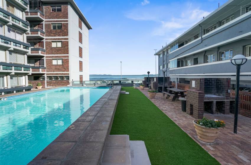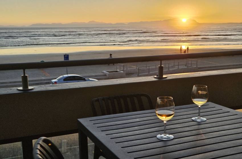 Glass sliding doors lead to the spacious balcony boasting breathtaking ocean views, with beautiful sunsets over Table Mountain. This outdoor space is furnished with a charming dining set, making it an ideal setting for enjoying leisurely meals or sipping drinks while basking in the sunset. Guests will have access to secure parking, a shared outdoor pool, and a communal braai area.