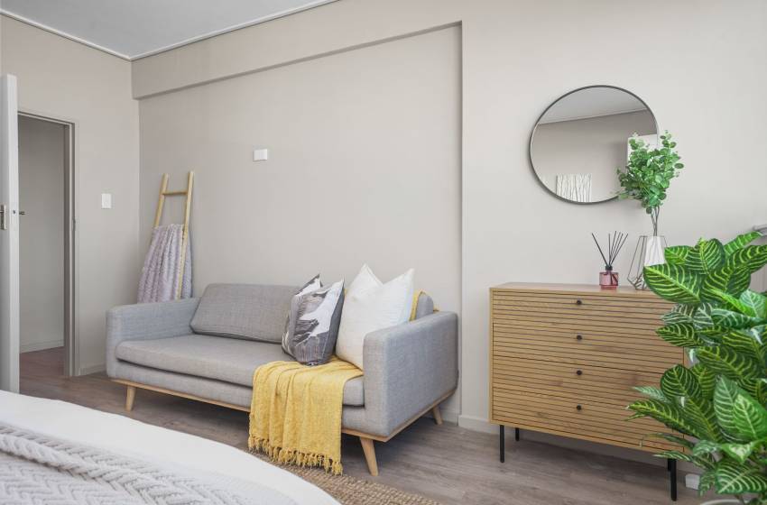 In the seaside resort town of Strand in the Western Cape, you will find this chic two-bedroom apartment that comfortably accommodates up to four guests. Upon entering, you will be greeted by the sleek and modern design of the apartment, bathed in natural light, offering a sophisticated urban living experience.