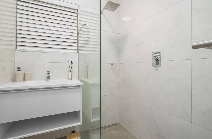 The apartment has two bedrooms. The spacious main bedroom is furnished with a comfortable queen bed with nightstands on either side. It offers ample storage space for your wardrobe and features a stylish couch at the foot of the bed, while the second bedroom is fitted with two single beds and a nightstand. The bathroom features a spacious walk-in shower, a basin with a bathroom cabinet, with a separate toilet fitted with a washbasin and vanity.