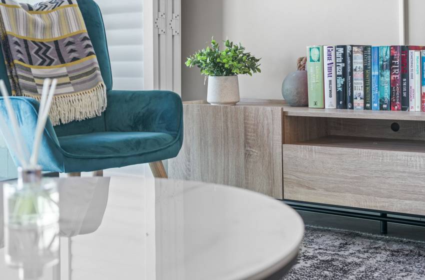 Adjacent to the dining area, the thoughtfully designed lounge invites relaxation, featuring a plush sofa paired with a single armchair. A sleek coffee table sits at the centre, creating a perfect spot for refreshments or casual conversations, and for entertainment, there is a TV cabinet housing a mounted flatscreen television. Guests will also have internet access throughout the apartment.