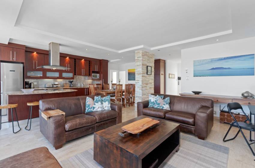 The apartment boasts a comfortable open space lounge and dining area with breathtaking sea views creating a family-friendly environment. The lounge is fitted with a TV for in-room entertainment, complemented with internet access. For those who prefer to stay in, the fully equipped kitchen includes an oven, refrigerator, stove, microwave, toaster, coffee machine, kettle, dishwasher as well as a washing machine and a tumble dryer.