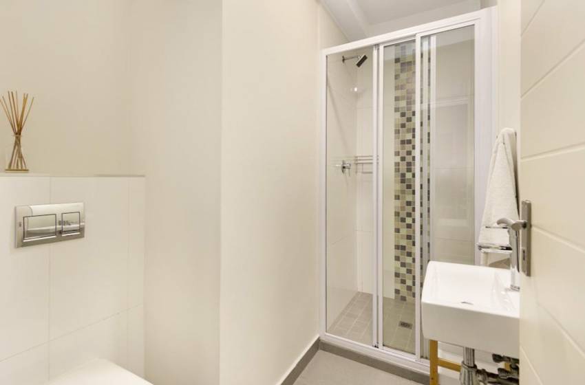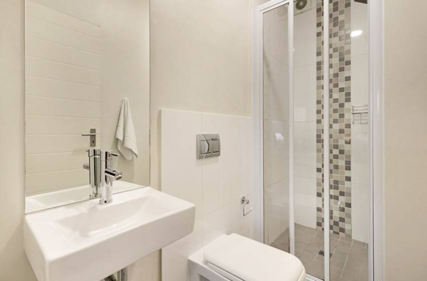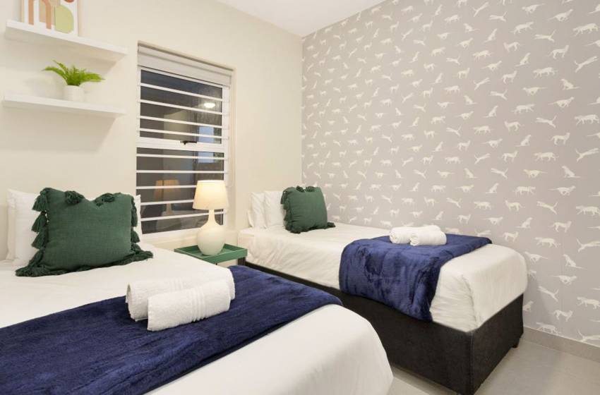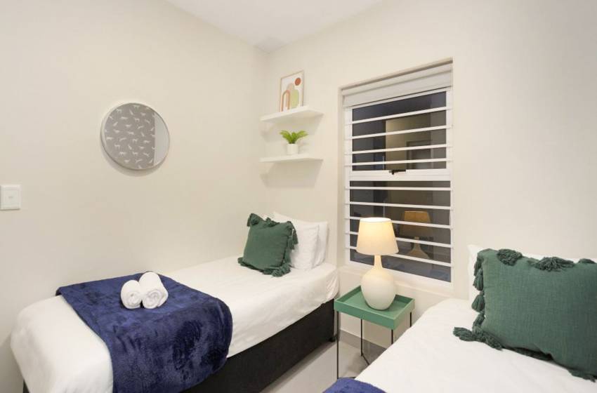 The bedrooms are spacious and stylishly furnished to reflect the area’s tranquil vibe. The master bedroom has a double bed, balcony access and an en-suite bathroom with a shower. The second bedroom has 2x single beds (pushed together), accessing the apartment’s shared bathroom fitted with a shower.