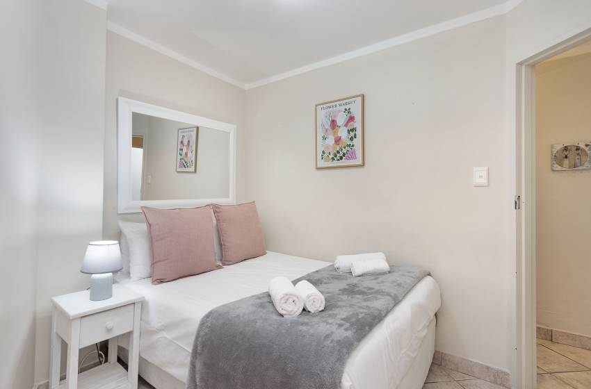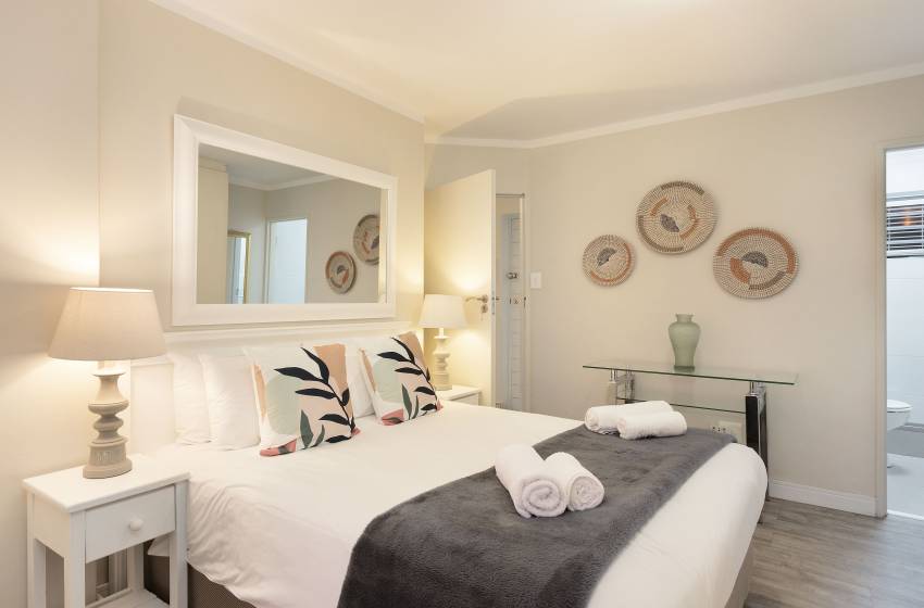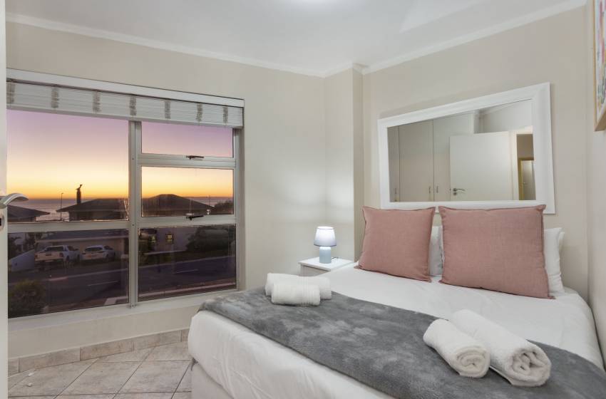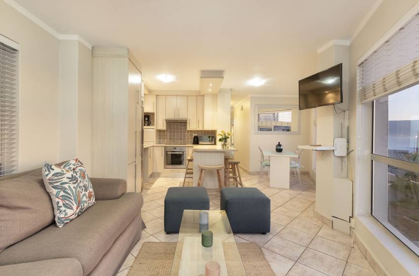 Boasting a light and airy aesthetic, this home has an open plan living area consisting of a full kitchen fully equipped with all appliances needed for self-catering, a cosy 4-seater dining table, and a lounge. The lounge features WiFi to keep you connected, a wall-mounted TV and floor-to-ceiling windows offering ample natural light and sea views. A standout feature of this apartment is the balcony, which offers stunning ocean and mountain views, complete with comfortable seating—ideal for entertaining.