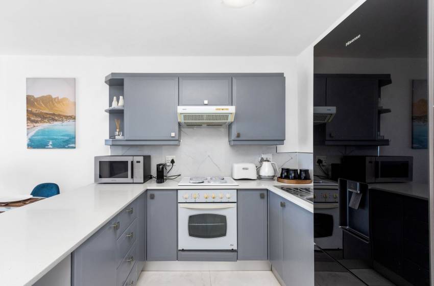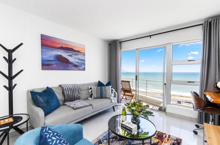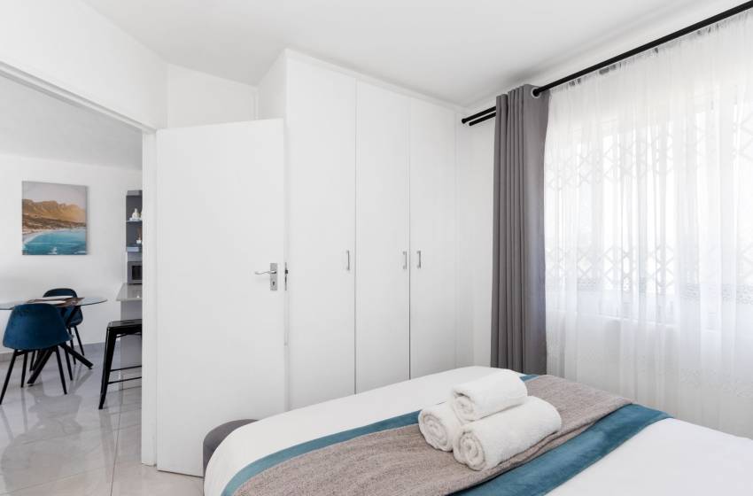 The open-plan design of the living area provides a serene flow within the space with sufficient natural light and fresh air entering the environment. The chic, fully equipped kitchen caters for all your culinary needs and looks onto an intimate dining area, seating two people comfortably. The cozy lounge is finished with beach inspired décor, a flat screen TV as well as a desk to work from. Leading out from the lounge is a quaint, undercover balcony including outdoor furniture where you can sit for hours taking in the most spectacular views of the famous Table Mountain and the endless stretch of beaches.