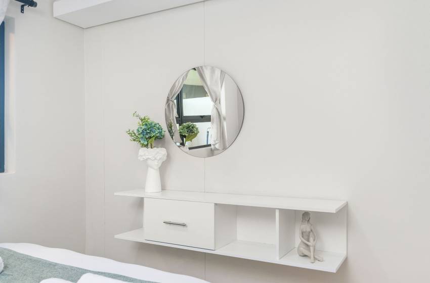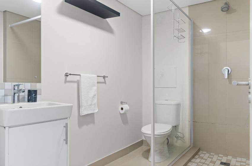 The bedroom features a queen-sized bed with a nightstand. Additionally, this room contains a wardrobe that provides ample space for clothing and storage. The bathroom contains a tiled shower, washbasin, and toilet.