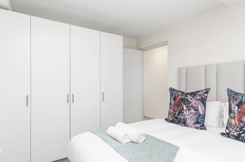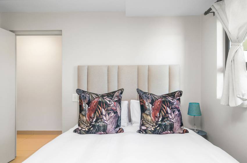 Walking into the property, you are greeted with an open-plan kitchen and lounge. The kitchen is equipped with all necessary amenities for a comfortable self-catering stay, with a washing machine for added convenience. The kitchen seamlessly flows into the lounge, creating a space that is intimate yet spacious. The lounge is bathed in natural light streaming in from the large windows. The space is stylishly furnished with a comfortable 2-seater couch, modern coffee table and a flatscreen TV. Wi-Fi is available throughout the apartment.