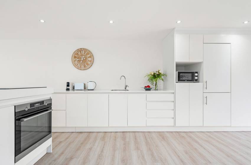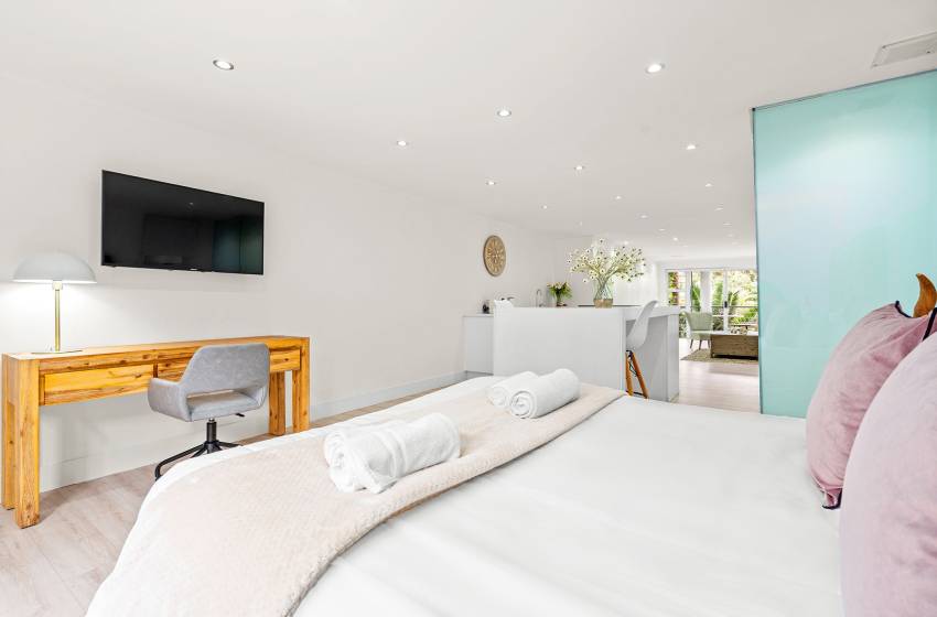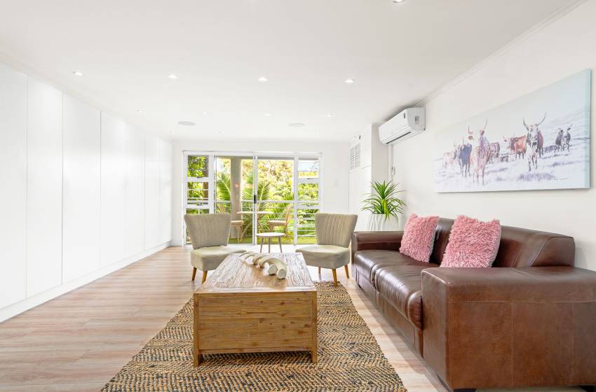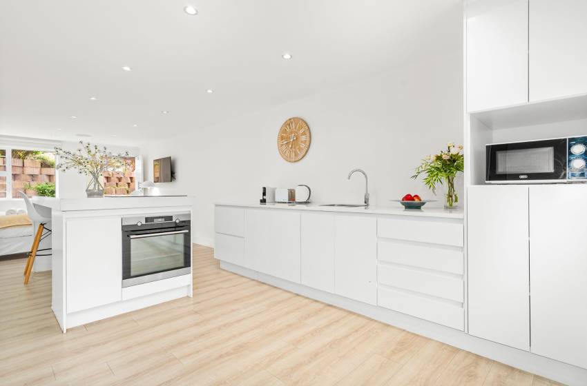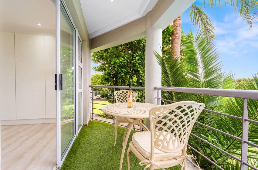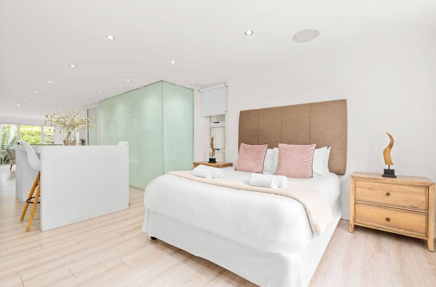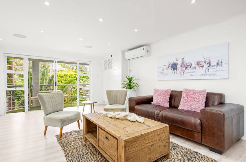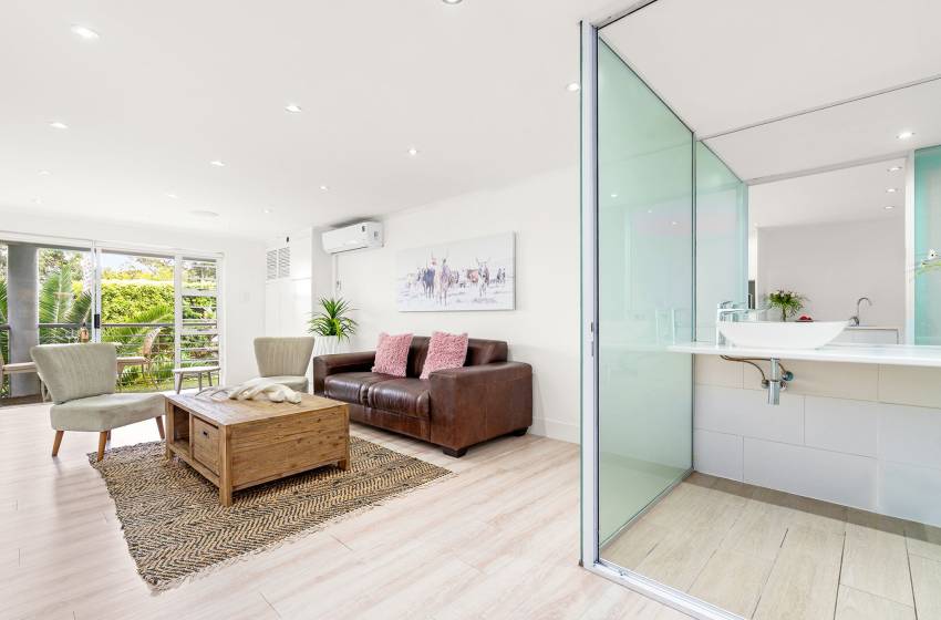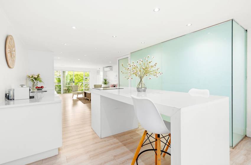 The Oceana 21 welcomes guests into a beautifully designed open-plan living space with neat and modern finishes. The kitchen is fully equipped with all your culinary needs and includes a stove, oven, kettle, microwave, and a Nespresso machine. The kitchen island, complete with seating, provides an inviting space to enjoy your favourite meals. The lounge area offers a refined setting to relax and unwind on a comfortable sofa, creating the perfect space to enjoy a peaceful and inviting atmosphere. Step out of the lounge through glass sliding doors onto a quaint undercover balcony with outdoor furniture overlooking the sparkling blue swimming pool and lush greenery.