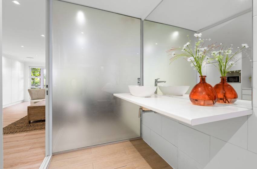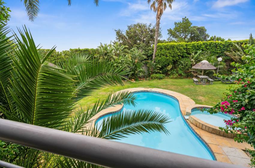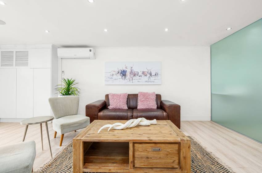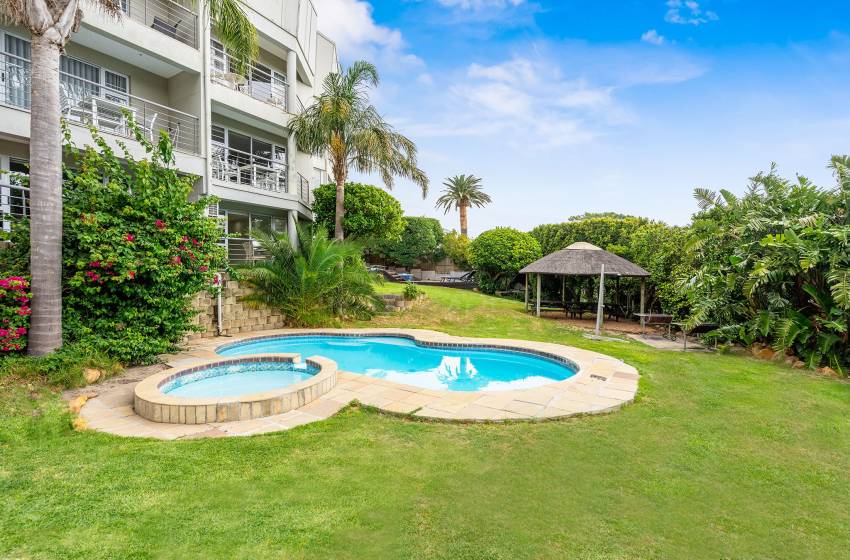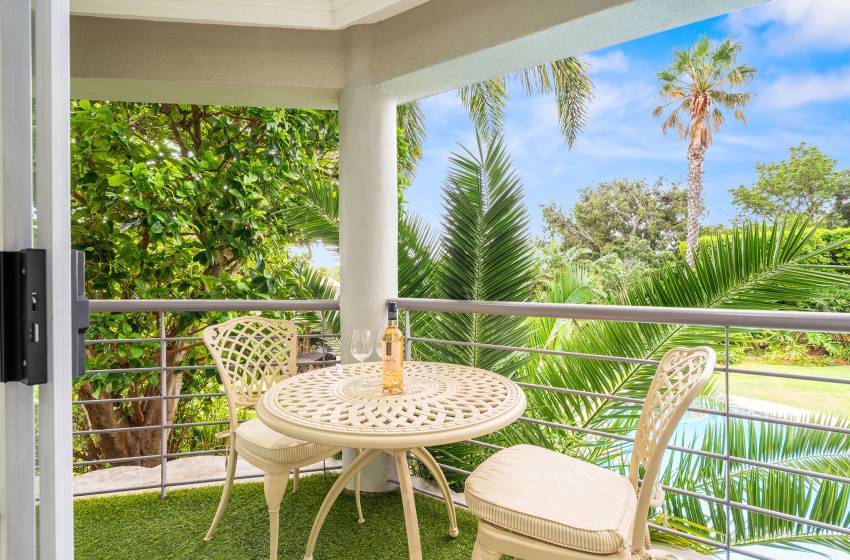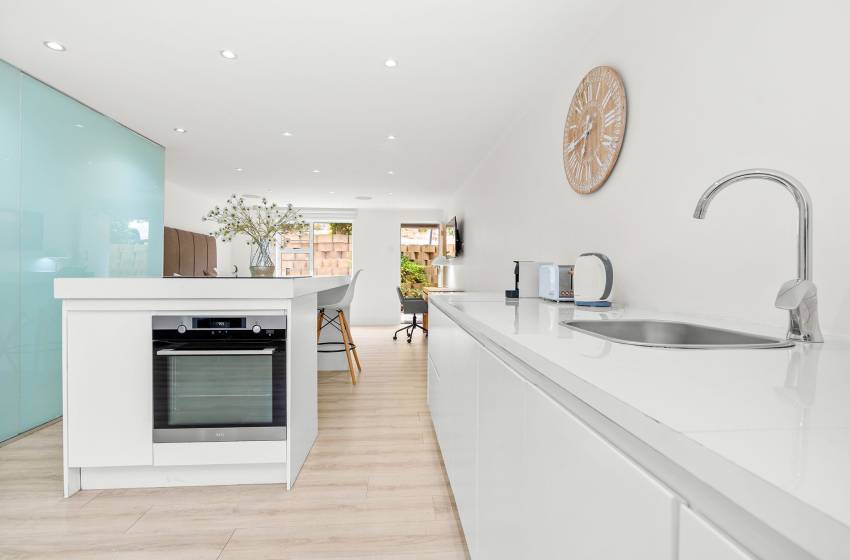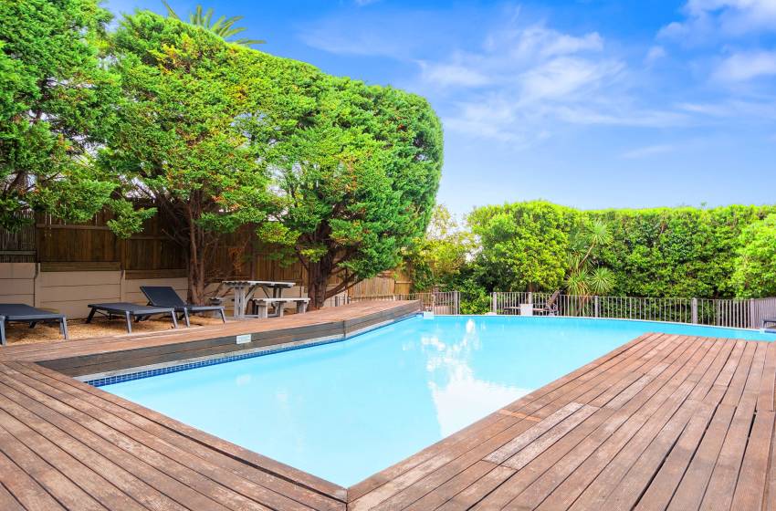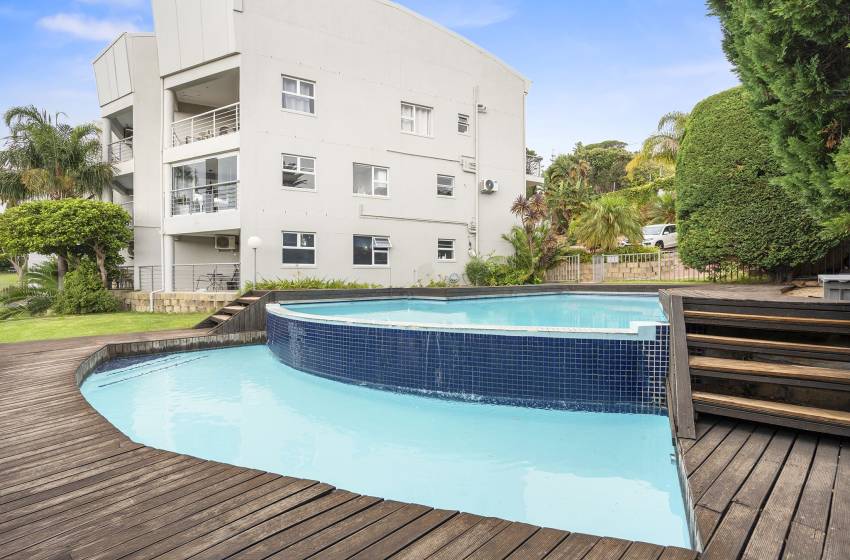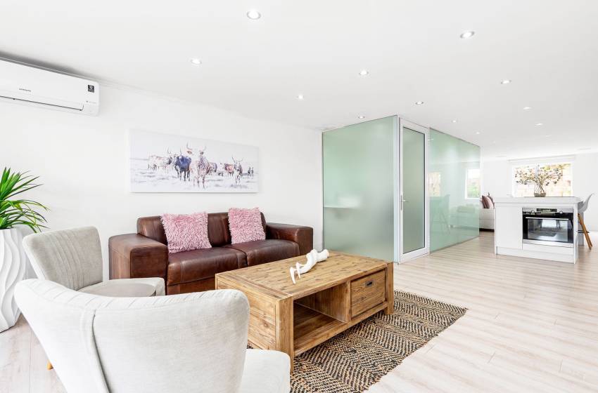 The Oceana 21 welcomes guests into a beautifully designed open-plan living space with neat and modern finishes. The kitchen is fully equipped with all your culinary needs and includes a stove, oven, kettle, microwave, and a Nespresso machine. The kitchen island, complete with seating, provides an inviting space to enjoy your favourite meals. The lounge area offers a refined setting to relax and unwind on a comfortable sofa, creating the perfect space to enjoy a peaceful and inviting atmosphere. Step out of the lounge through glass sliding doors onto a quaint undercover balcony with outdoor furniture overlooking the sparkling blue swimming pool and lush greenery.