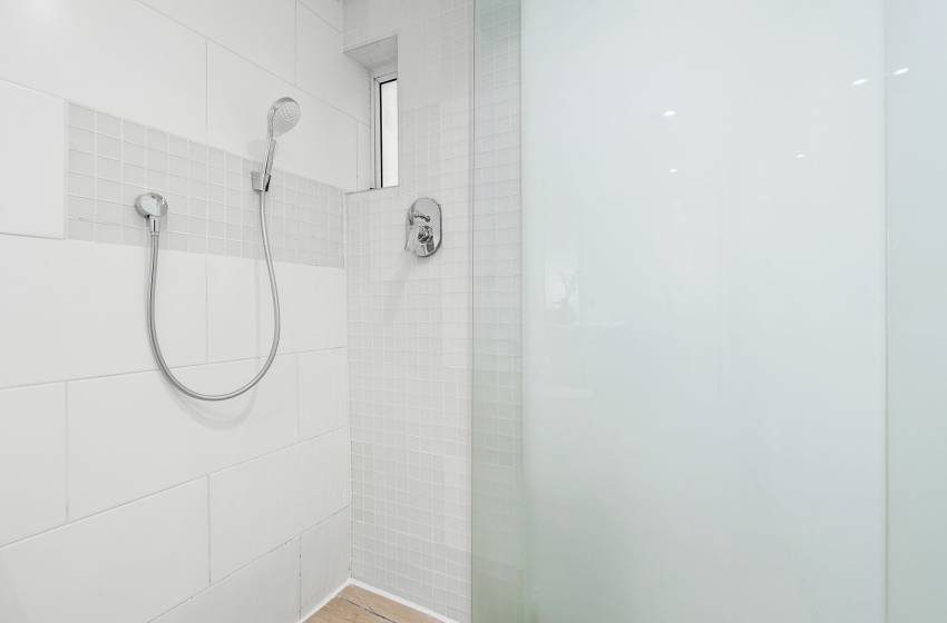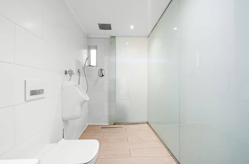A cosy double bed, complemented by bedside tables, ensures a restful night’s sleep. Opposite the bed, a television is positioned above a small desk and chair, allowing for comfortable viewing from bed. The bathroom is well-appointed with a basin, toilet, urinal, and a generously sized walk-in shower.