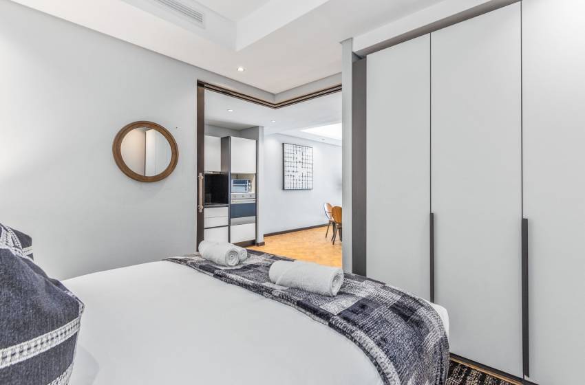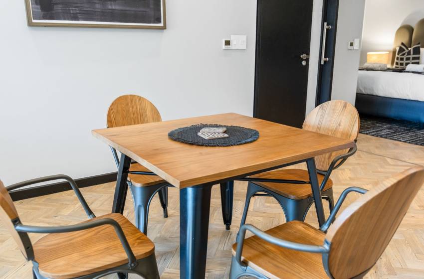 The open-plan living area boasts an inviting space that seamlessly integrates the kitchen, dining, and lounge areas. The fully equipped kitchen includes modern appliances and includes a dishwasher, making self-catering a breeze. Enjoy meals at the dining table which comfortably seats 4, or relax in the cozy lounge area featuring a comfortable suite and a wall-mounted flat-screen TV. Take in the stunning views of Cape Town’s beautiful skyline from your window.