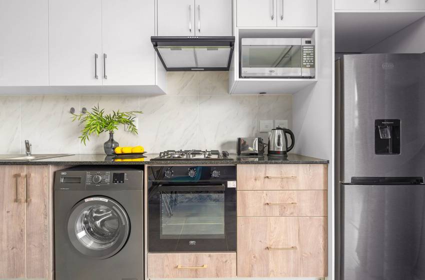 Upon entering the apartment, you will be greeted by the open-plan design of the property with an abundance of natural light streaming in from the balcony. The kitchen is fully equipped with everything you’ll need for a comfortable self-catering stay, including a front-loading washing machine for added convenience.