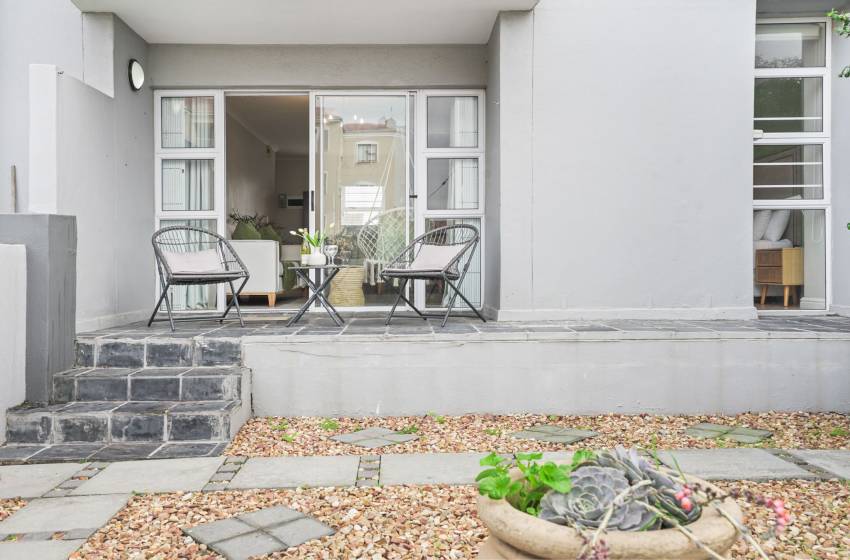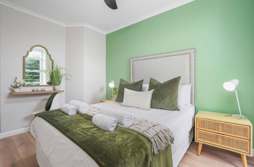 The spacious living area features comfy seating, a flatscreen television, Wi-Fi access throughout the property, and a cosy ambience, perfect for relaxation after a day of exploring. Sliding doors lead to the patio, which has a courtyard with an outdoor braai. Guests will also enjoy access to the communal swimming pool and benefit from two secure parking bays.