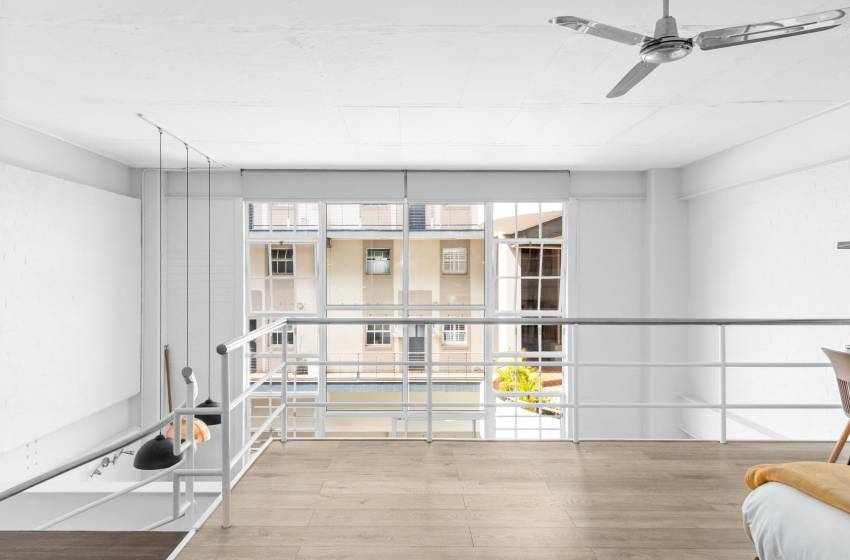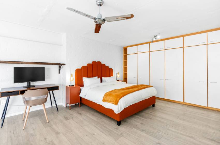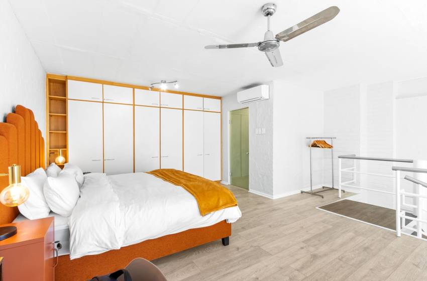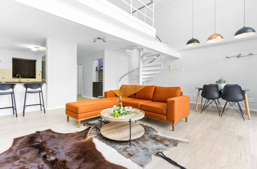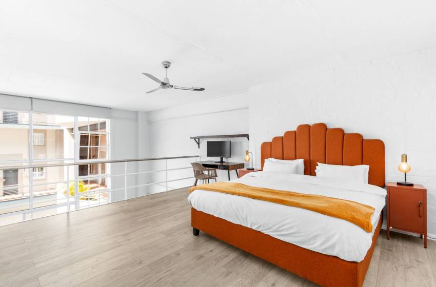A stunning spiral staircase leads you to a serene and tranquil loft bedroom offering a king size bed, a ceiling fan, air-conditioning, sufficient cupboard space as well as a desk and chair. Additional features include internet access, secure parking, concierge services, linen and towels provided with your stay.