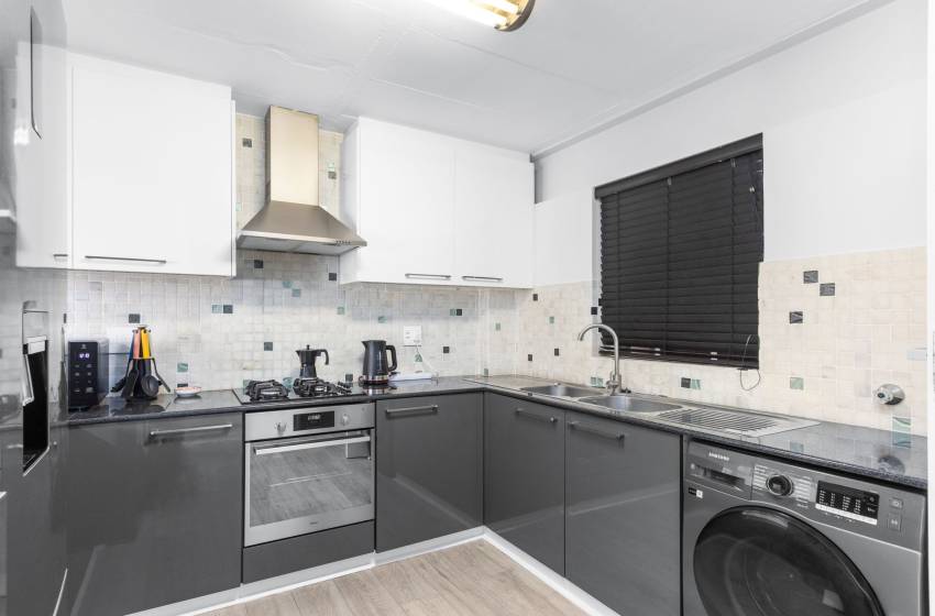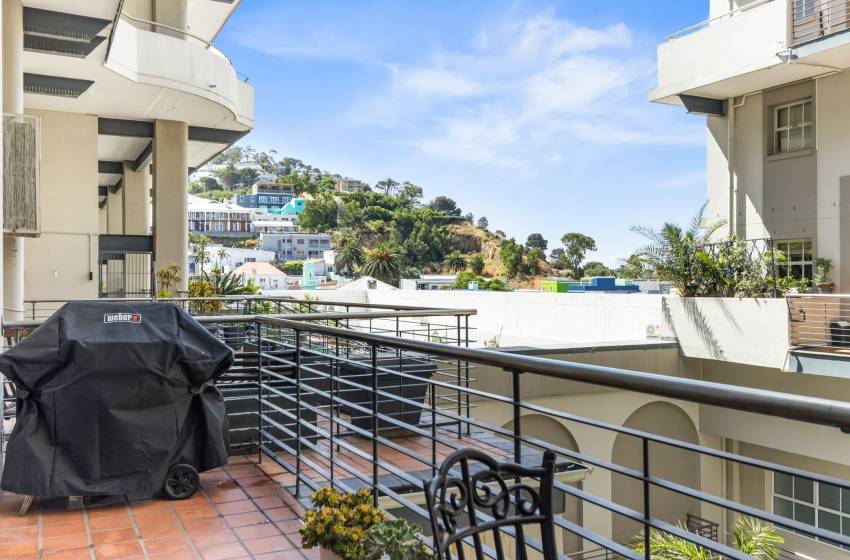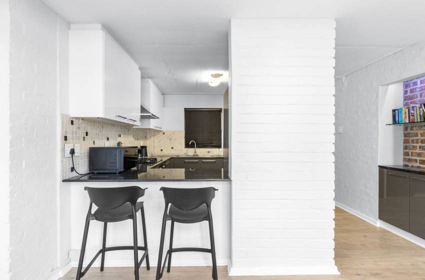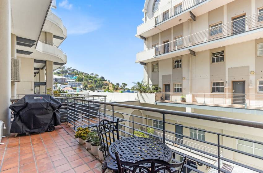 Relax and unwind in this stunning apartment with high ceilings, white walls and ceiling high windows in the living area, allowing an abundance of natural light into the room, featuring pops of colour. The fully equipped kitchen, with seating for two, caters for all your culinary needs and includes a gas stove and washing machine for your convenience. Kick up your feet, take advantage of the comfy couch and enjoy the streaming features on the flat screen TV in the well appointed lounge area which is adjacent to an intimate dining table comfortably seating four people where you can sit and enjoy your favourite meals. The living area leads out onto a gorgeous balcony with outdoor furniture, braai facilities and beautiful views.