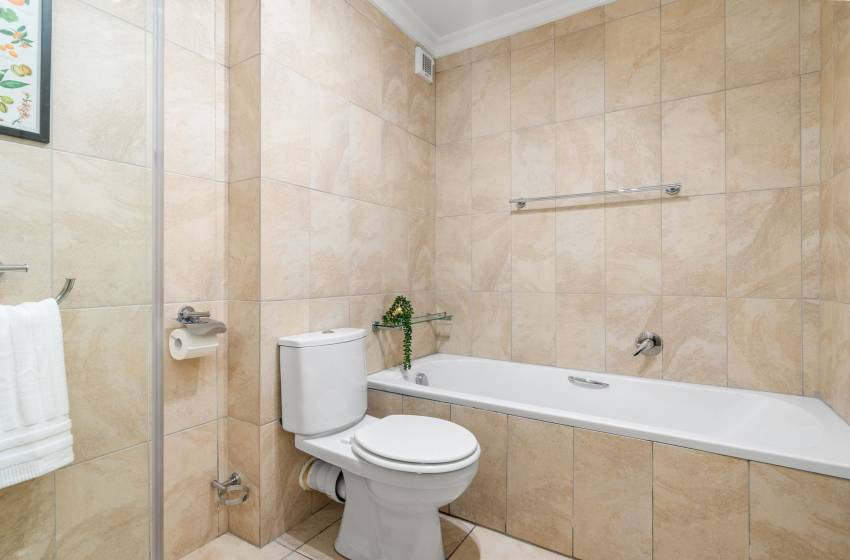 The apartment includes two tastefully furnished bedrooms. The main bedroom features a king-size bed and a vanity with cabinets and a chair that serves as both a workspace and dressing table. This room also boasts an en-suite bathroom with a shower, washbasin with vanity, and a toilet. Sliding doors lead to a private balcony with serene views. The second bedroom is fitted with a double bed, nightstands on either side, and ample wardrobe space. A second shared bathroom includes a shower, bathtub, washbasin with vanity, and toilet. Fresh linen and towels are provided for your comfort.