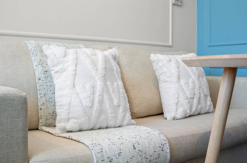 The lounge area features a minimalist-inspired couch with cushions and a throw blanket added for relaxation and style, while you enjoy entertainment from a mounted flatscreen television. It also includes a compact dining space that features a table and seating for two.