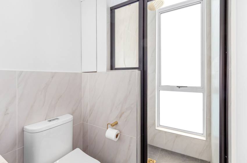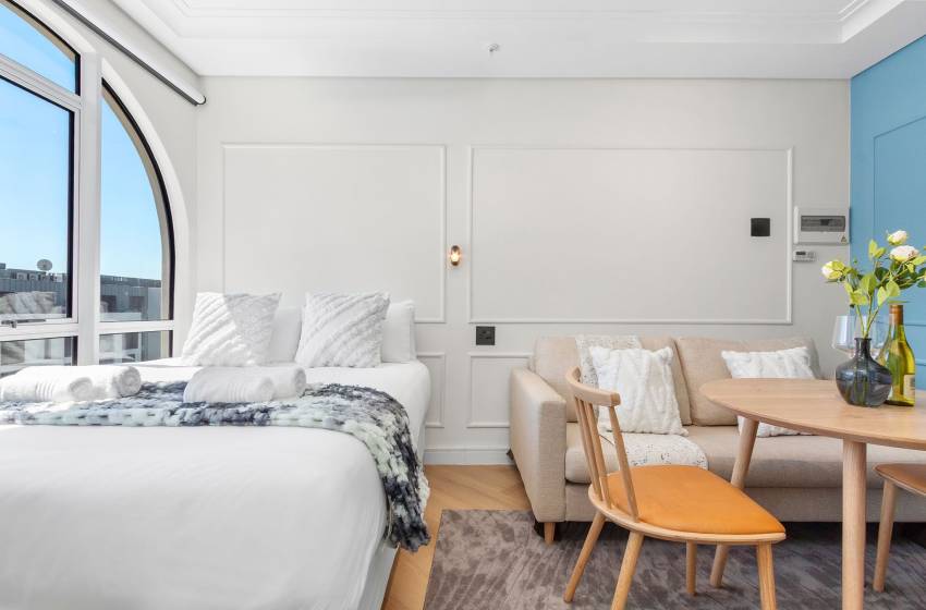 This modern apartment features an open-plan space, where the bedroom and lounge share the same inviting setting. The bedroom is fitted with a cosy queen-size bed and a wall lamp. It also features an arch-shaped window that fills the apartment with natural light and provides lovely views of the neighbourhood. The bathroom is modernly designed and well-appointed, equipped with a floating vanity with a sink, a shower, and a toilet. Linen and towels are provided with your stay.