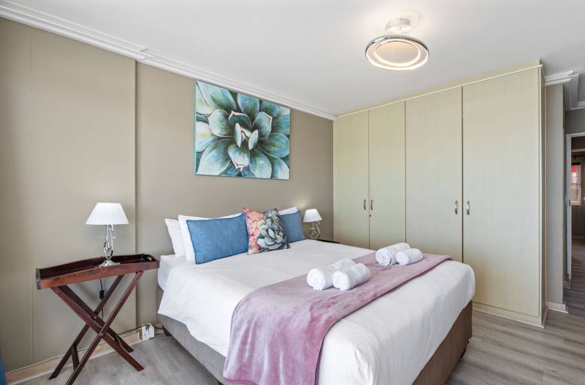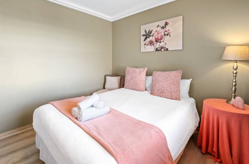 Boasting all amenities needed for a comfortable self-catered holiday, this apartment has luxurious decor in neutral shades providing a space to relax and reset. The open-plan living area has a fully-equipped kitchen and furnished lounge with a flat-screen TV with DSTV and WiFi. The balcony will treat you to a fantastic view with a picnic bench, perfect for outdoor dining or relaxing with sundowners as you admire the gorgeous twilight sky. The main bedroom has a queen bed, balcony access and an en-suite bathroom with a bathtub/shower combo. The second bedroom has a double bed, accessing the shared bathroom fitted with a shower.