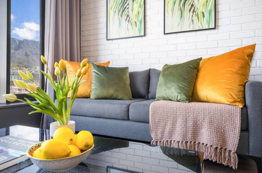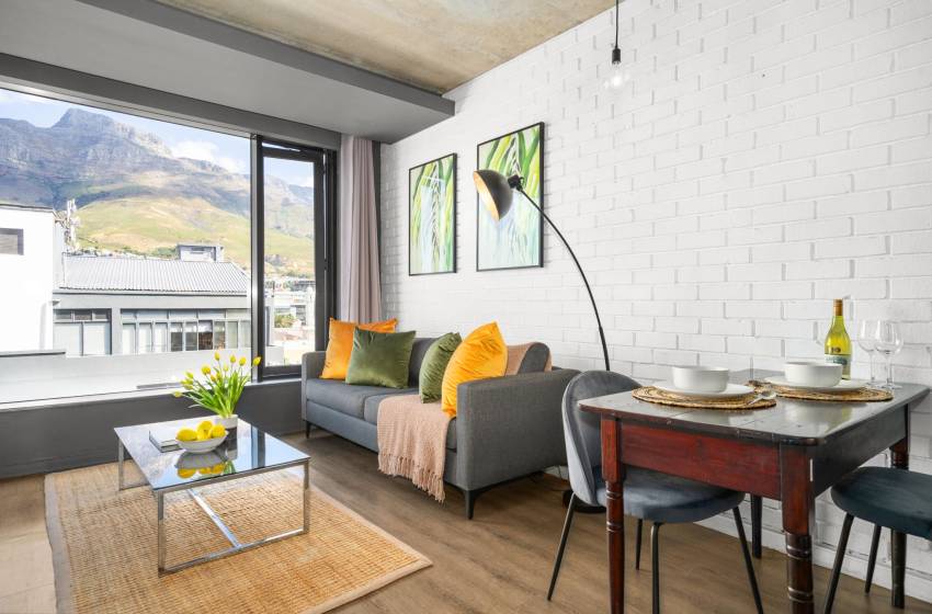 The property features an open-plan living area with a fully equipped kitchen, dining space and lounge, presenting a comfy sofa, plasma television as well as internet access. A quaint space, boasting a magnificent view of South Africa’s Mother City, leads out from the living area through a large glass window.