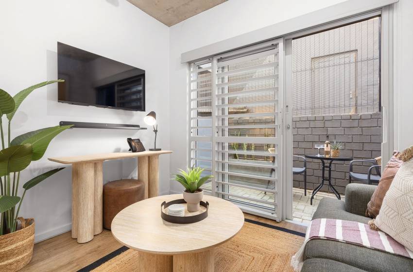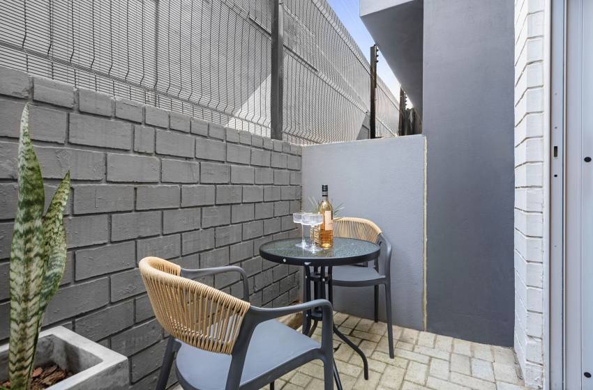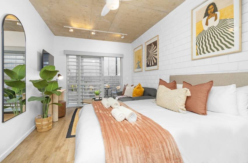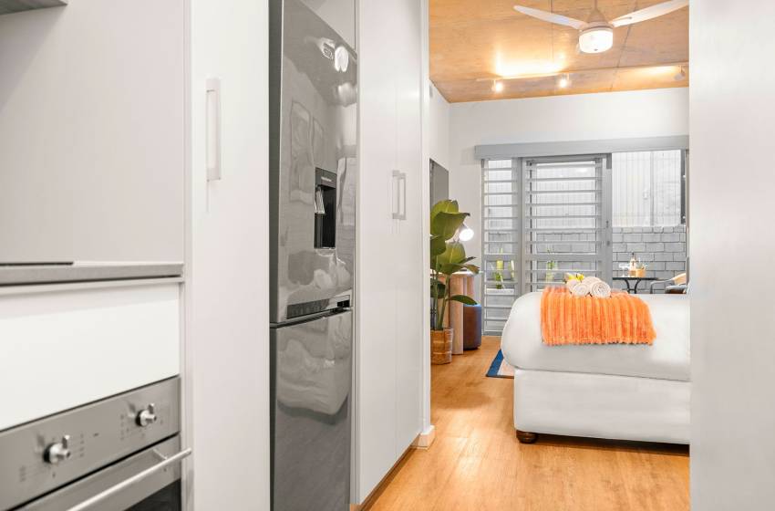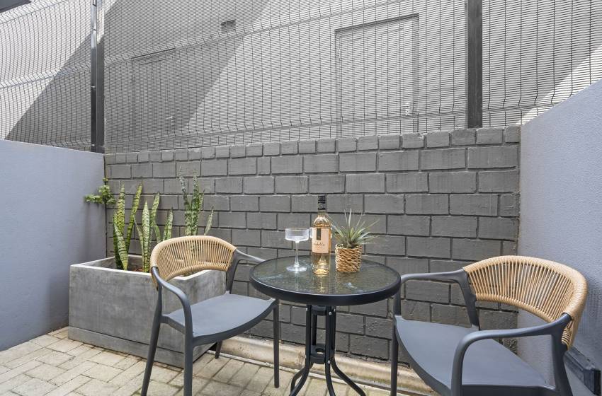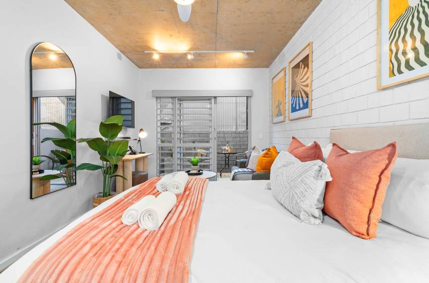 The open plan living space features a fully equipped kitchen catering for all your culinary needs, a sleeping area, and a cozy lounge with a flat screen TV and plush sofa. Leading out from the lounge is a beautiful, quaint patio area, allowing an abundance of fresh air and natural light to fill the apartment.