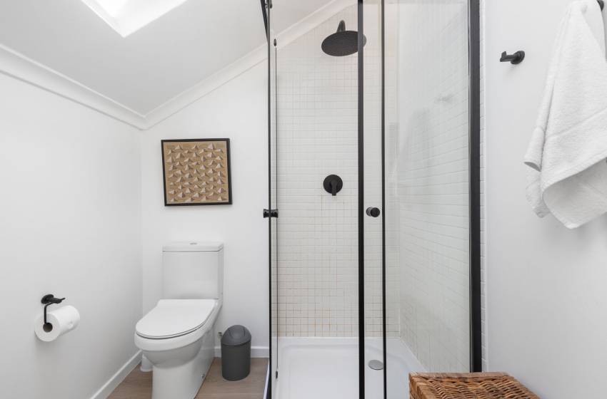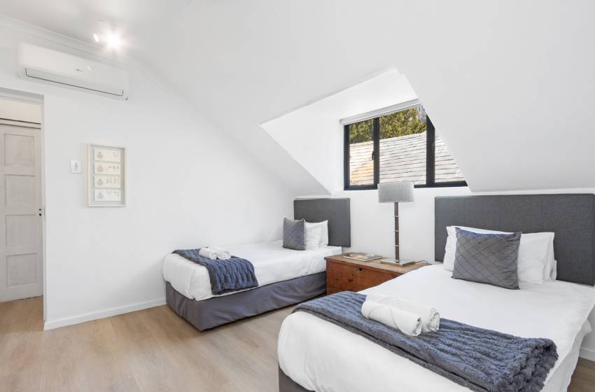 The house features four elegant bedrooms: the first is a king-size suite with an ensuite bathroom, and the second is a queen-sized bedroom with its own ensuite bathroom. The third bedroom has a double bed with an ensuite bathroom, while the fourth bedroom comes with two single beds and air conditioning, and shares a bathroom, making it perfect for families or groups. Each bathroom is designed for comfort, with one featuring a bath and the others equipped with showers.
