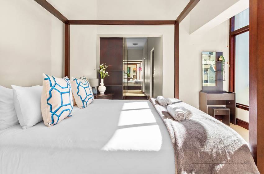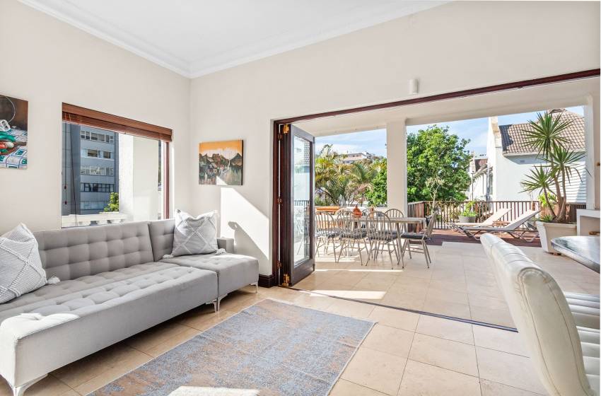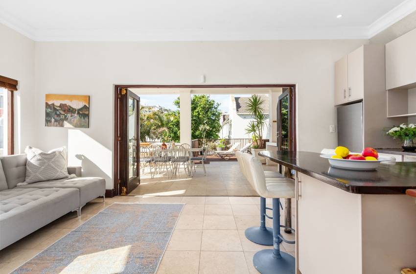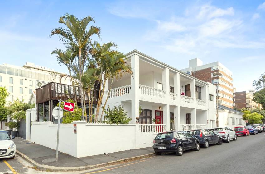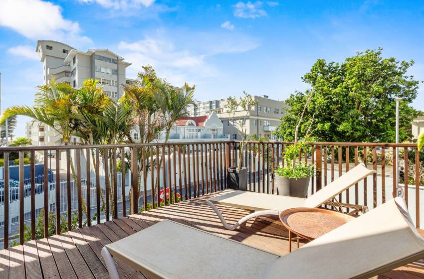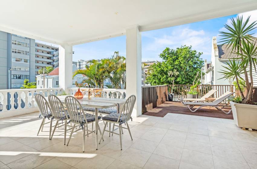 Upstairs, guests will find two bedrooms and two bathrooms, while the third bedroom and an additional bathroom are located downstairs. The main bedroom features a king-sized bed, air conditioning, and access to a beautiful private balcony complete with an outdoor dining table for eight, a braai area, and breathtaking views overlooking the historical buildings of Sea Point.