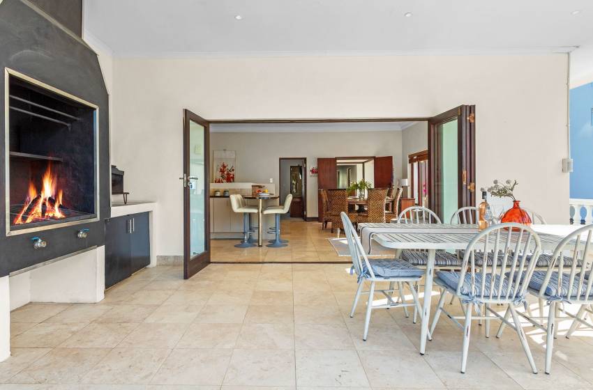 The living room offers a cosy yet elegant setting with a woven sofa and armchairs, a flat-screen TV, and Wi-Fi throughout the property. The home is load-shedding friendly, supported by a large generator to keep the lights and internet running without interruption.