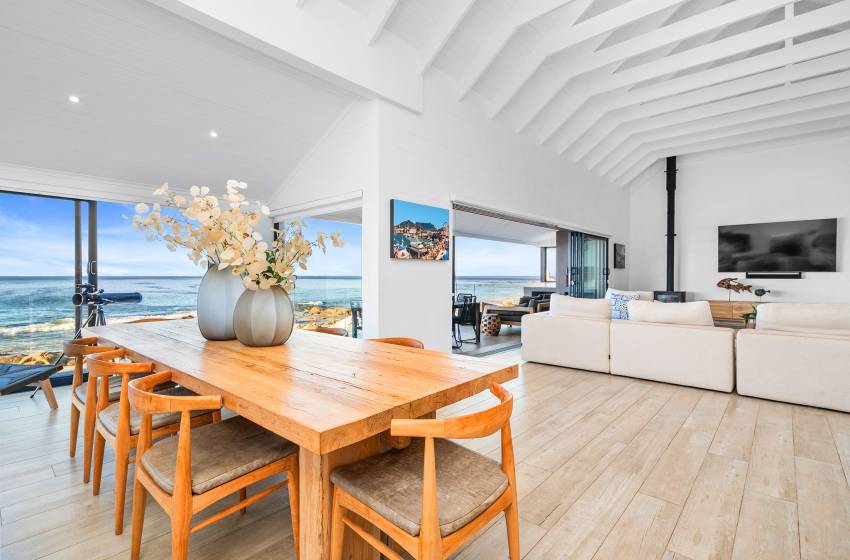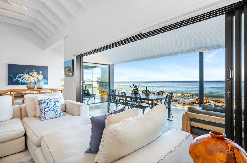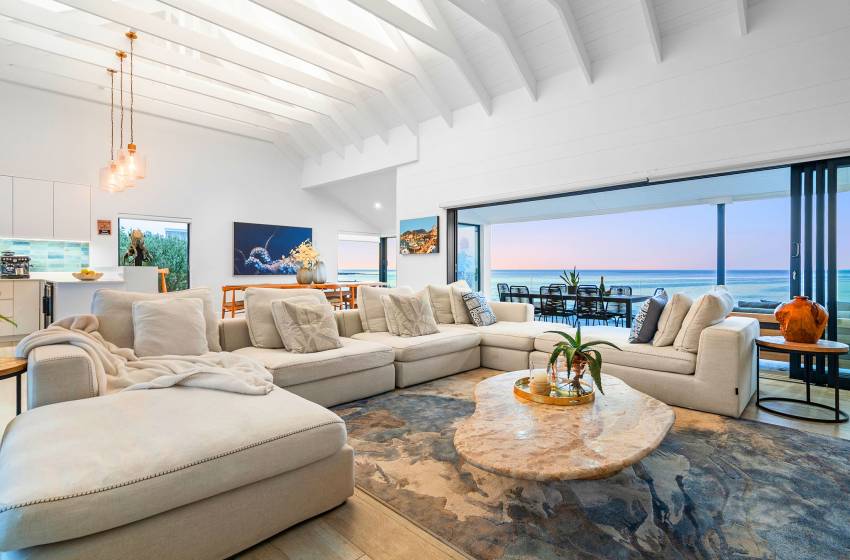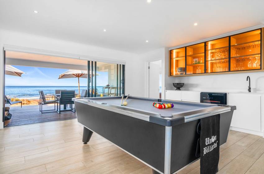 Large stackable glass doors lead guests out from the living area onto a magnificent patio boasting spectacular ocean views featuring an outdoor fireplace, comfortable outdoor furniture and a dining table with chairs seating eight guests. Upstairs living areas open to balconies with glass balustrade and sea-facing outlooks. This is the perfect spot for entertaining or just relaxing while taking in your surroundings. For added entertainment, guests can make use of the pool table and lounge area on the lower level of the house, or make their way down to the beautiful sandy beaches via a private walkway directly from the villa. After a refreshing swim, rinse off the sand and salt under the convenient outdoor shower by the beach before heading back inside to relax.