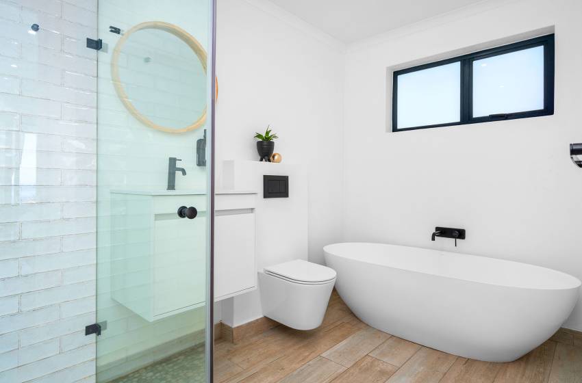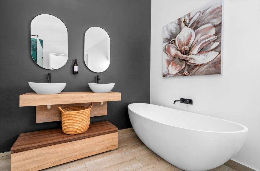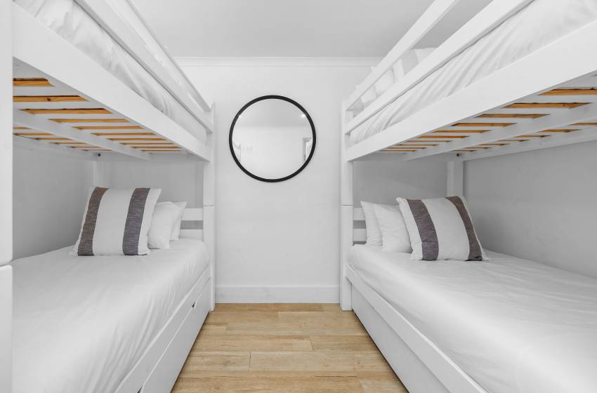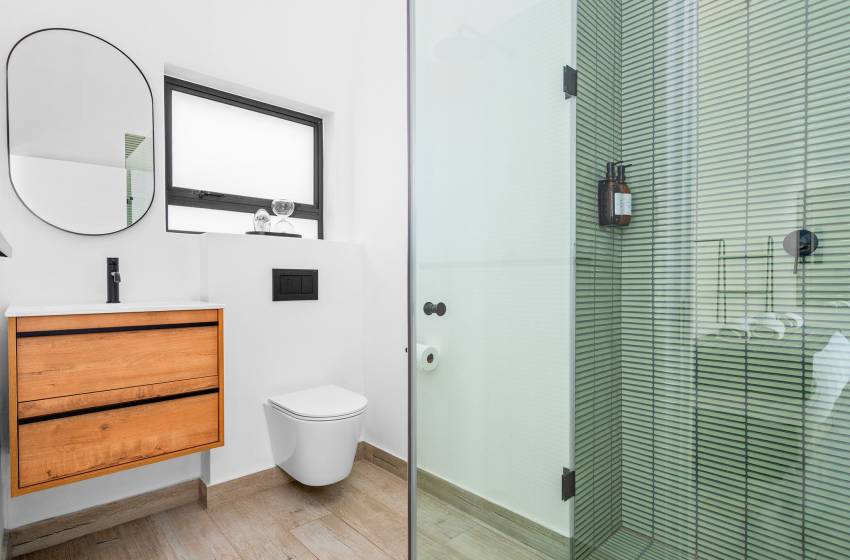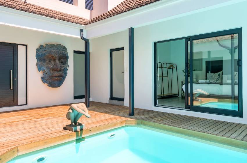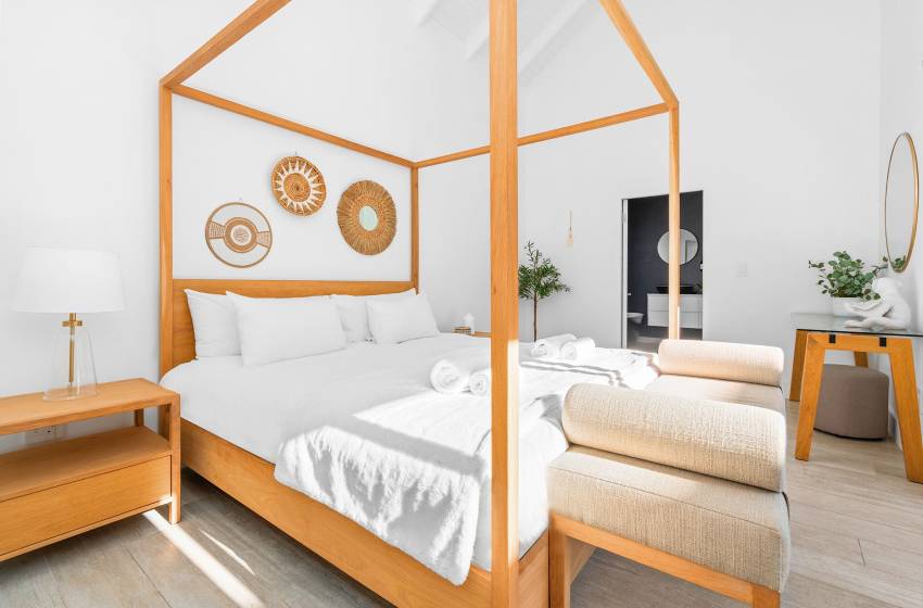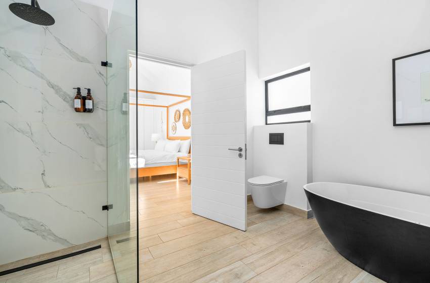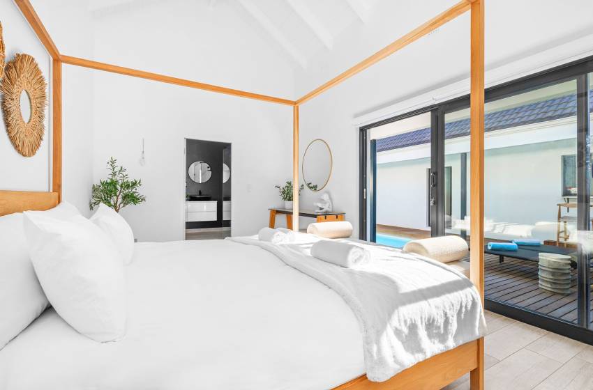 The Villa boasts six beautifully appointed bedrooms with three of the bedrooms surrounding the pool while the other three bedrooms are downstairs. The upstairs bedrooms are all pool facing with access to the pool deck through glass sliding doors, they all have king size beds and en-suite bathrooms featuring a bath, shower, toilet and basin in each en-suite and an additional guest bathroom with a toilet and shower alongside the pool area. The downstairs bedrooms offer two bedrooms with queen size beds and en-suite bathrooms including a bath, shower, toilet and basin in each as well as access to the outside deck area while the third bedroom features two sets of bunk beds making 4 single beds available in this room.