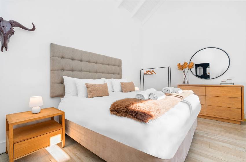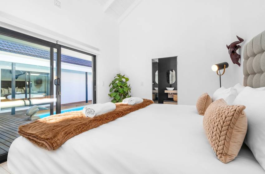Enter the property and be greeted by a large majestic swimming pool where guests can enjoy cooling off on hot summer days, soaking up some sun on the sun loungers or sipping some cocktails at the seated area alongside the pool. From the pool deck, step in to beautifully designed open plan living space, exuding modern decor and elegance. High rise ceilings with exposed beams create a more spacious environment with large glass windows and doors surrounding the vicinity, allowing for an abundance of natural light to flood the space. The sizeable kitchen with counter side seating is fully equipped with everything you need for a comfortable self catering stay ensuring all your favourite food and drinks are prepared in style. For added convenience there is a dishwasher and washing machine in the scullery area of the kitchen. The kitchen overlooks an intimate dining area, seating up to eight guests at a large wooden dining table and the cozy lounge area with a plush U-shaped sofa and mounted flat screen TV makes the ideal place to get comfortable and unwind.