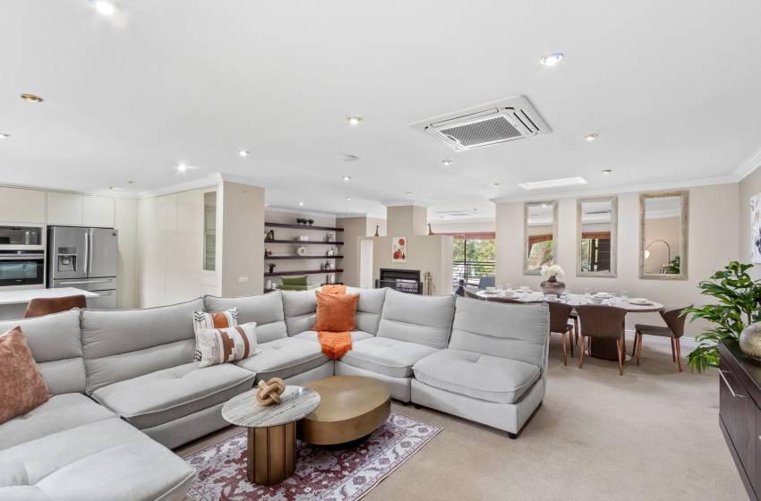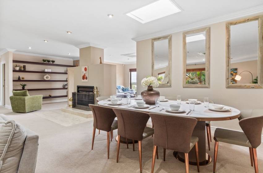 Perched in a truly special setting, this beautifully designed villa offers a one-of-a-kind layout that enhances both privacy and panoramic views. Reaching the main living areas involves ascending a series of elegant staircases, an experience that adds to the villa’s charm and sense of arrival. While the elevated position rewards you with stunning perspectives, a moderate level of mobility is recommended to fully enjoy this unique escape. The kitchen features a sleek and modern design, offering ample storage space with soft-close cabinets. The large countertop creates an intimate seating area with barstools. It is fully equipped with everything needed for a comfortable self-catering stay. The living space features a large, comfy sofa with plush finishes, a coffee table, air conditioning, a TV cabinet, and a mounted flat-screen television—creating the perfect spot for relaxation and entertainment. Complementing this area is an additional guest lounge, complete with an inviting indoor fireplace, offering a warm and welcoming space to unwind. Guests will enjoy Wi-Fi access throughout the property and streaming channels such as Netflix. The elegant dining room is furnished with a chic round dining table with seating for up to eight guests.