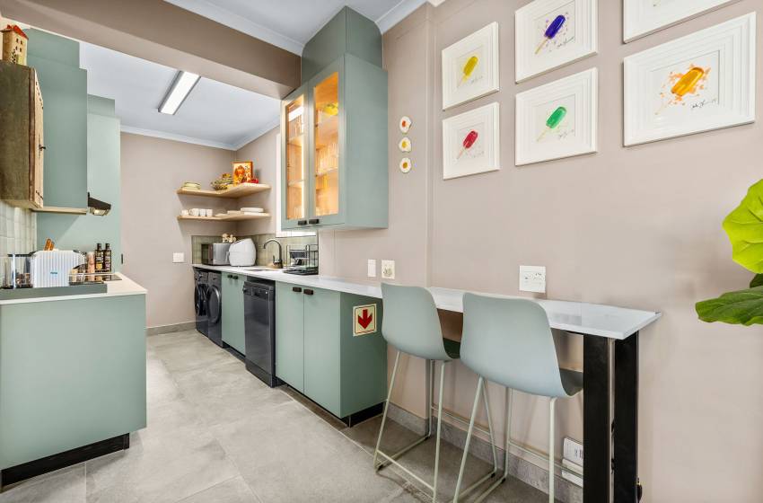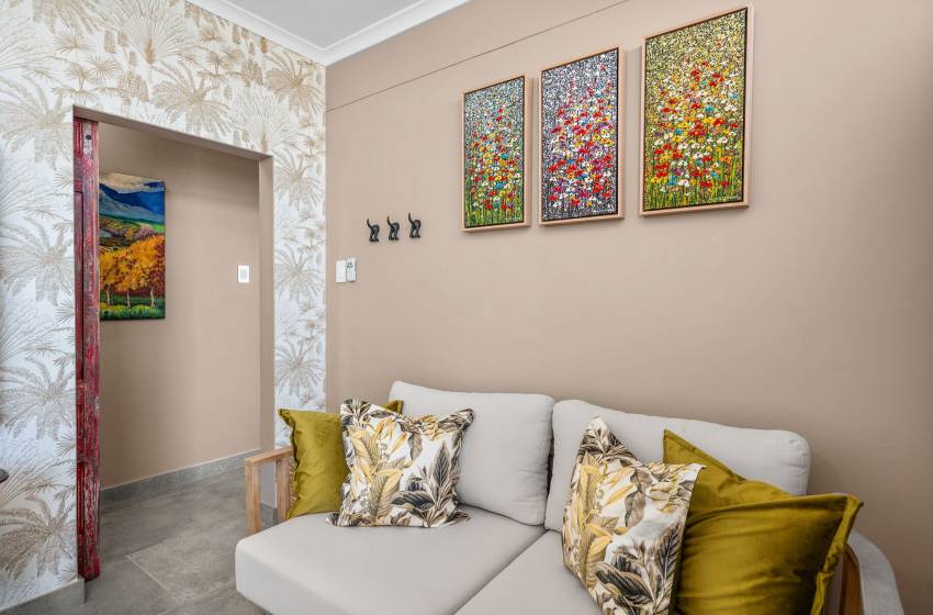 The apartment offers guests two tastefully decorated bedrooms, each with built-in cupboards. The large master bedroom with a king-size bed features nightstands with lamps and a cosy couch styled with colourful cushions, perfectly suited for curling up with a good book. The second bedroom is fitted with two single beds and boasts a sea view through the window. There is also one full bathroom with a shower, washbasin, and toilet, as well as an extra guest toilet.