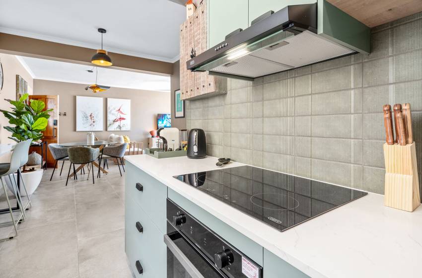 The fully equipped kitchen features a built-in electric hob, under-counter oven, dishwasher, and washing machine, which makes Waves & Wildflowers the perfect choice for guests who want the convenience of home-cooked meals and a comfortable stay during the holidays.