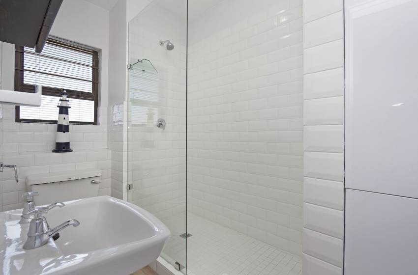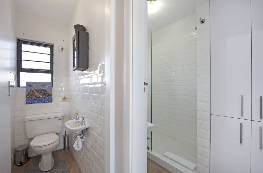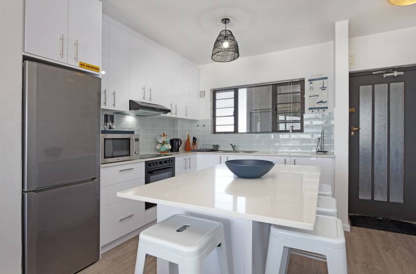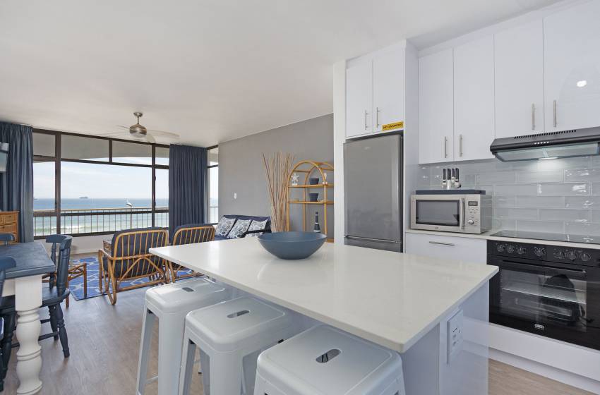 The apartment has an open plan kitchen and lounge with a cosy 3-seater dining table. The kitchen is fully equipped with every amenity necessary for self-catering and features island seating for 4. The lounge boasts a wall-length window with spectacular ocean views, a ceiling fan, a wall-mounted TV with a full bouquet DSTV, and access to the balcony. For guests’ convenience, the balcony features a gas braai and a 4-seater dining table - the perfect spot to enjoy a traditional South African braai and a glass of wine.