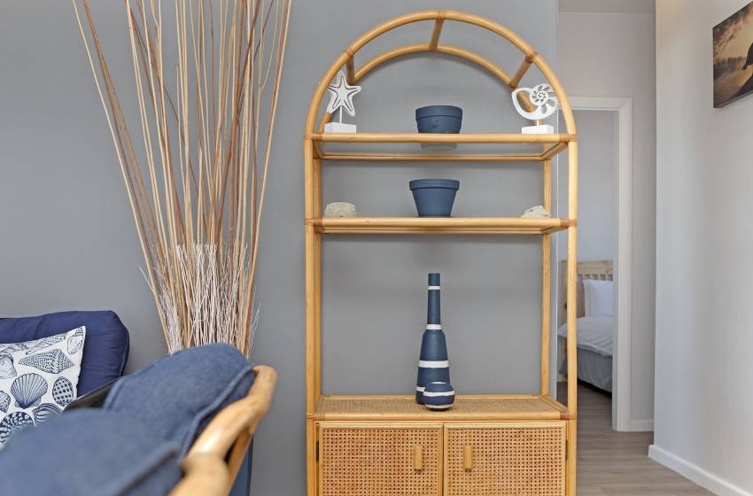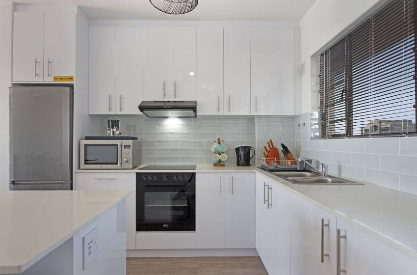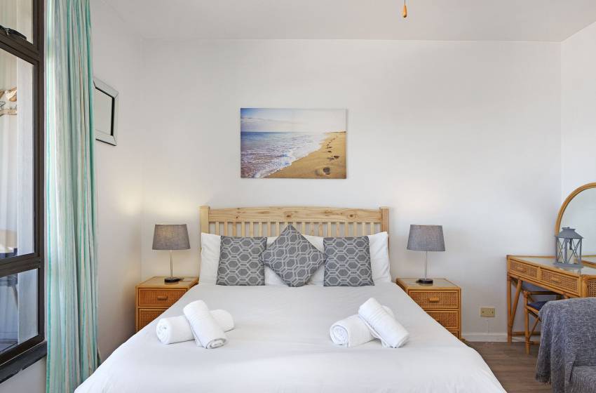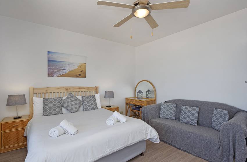 There are two spacious bedrooms, accommodating up to 4 guests. The master bedroom has a queen bed and a floor-to-ceiling window with ocean views, while the second bedroom has 2x single beds (ideal for children). Both bedrooms have a ceiling fan to combat the summer heat and share the apartment’s shared bathroom (fitted with a shower) and guest toilet.